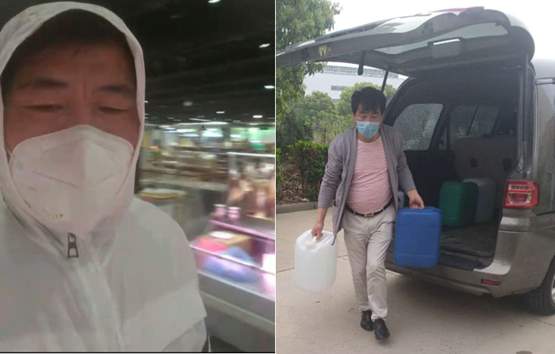 方雄文正在為工業(yè)園區(qū)各企業(yè)留守人員購(gòu)買生活物質(zhì)并將采購(gòu)的防疫物質(zhì)